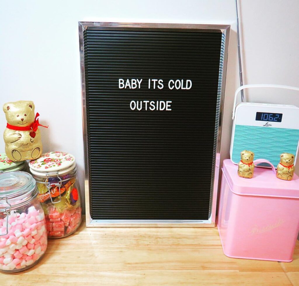 Inside, the jars are filled to the brim with pastel marshmallows and old-fashioned sweets, ready for hot chocolate emergencies or post-tears bribery. Our Lindt bears stand at attention, proudly wearing their festive red ribbons like guardians of cocoa and quiet moments. There’s a vintage-style radio forever tuned to either cheesy Christmas tunes or Smooth radio, and a soft pink tin hiding a highly vulnerable stash of biscuits (mostly the custard creams, unless the kids have discovered them again).