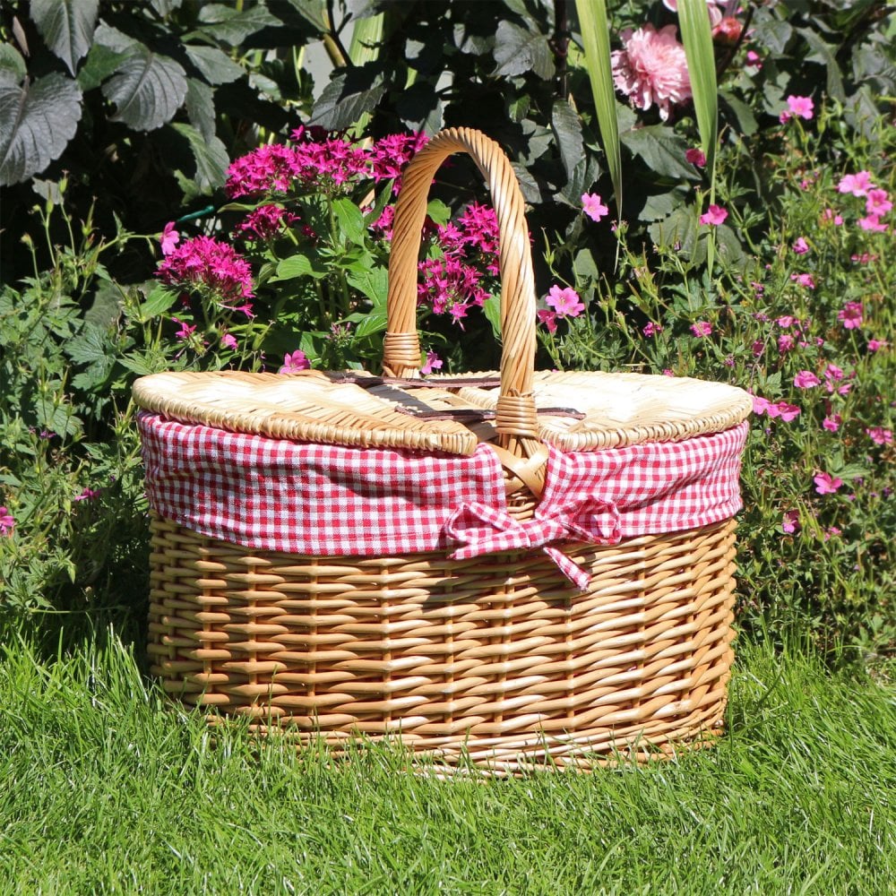 Oval Lidded Wicker Picnic Basket Red Check Lining available to buy from The Basket Company. This beautifully handcrafted double-lidded picnic basket features a neat oval design, made from sustainable buff willow and finished with a classic red check lining. The hinged twin lids lock securely, keeping your contents protected while making it easy to pack your own glassware, plates, and picnic favourites.